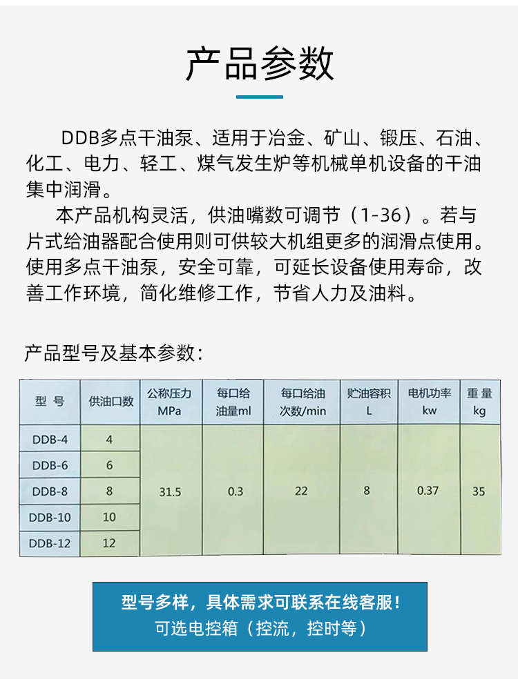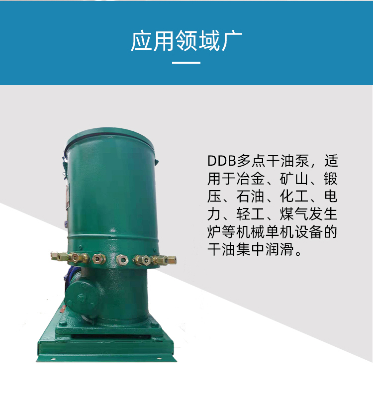 用途: DDB系列多點幹(gan)油泵适用于潤滑(hua)頻率極低、潤滑點(dian)不超過50點㊙️,公🌈稱壓(yā)力為10MPa的多線幹油(you)集中潤滑系統中(zhong)✔️。直接或通過單✉️線(xian)片式給油器向各(ge)潤滑點供送潤滑(huá)脂的裝置,特别适(shi)用🏃于破碎機、鍛壓(yā)機床、碼頭行吊,印(yin)刷機等小型的✌️單(dan)機設備。