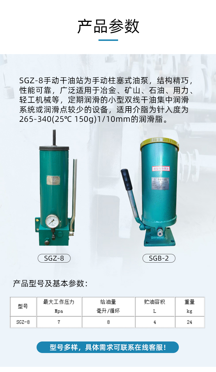 産品(pǐn)概述: 一、概(gài)述SGZ-8型手動(dong)幹油站為(wéi)手動柱塞(sai)式油泵,結(jie)構精巧,性(xìng)能可靠,廣(guǎng)泛适用于(yú)冶金、礦山(shan)、石油、用力(lì)、輕工機械(xie)等,定期潤(rùn)滑的小型(xíng)雙線幹