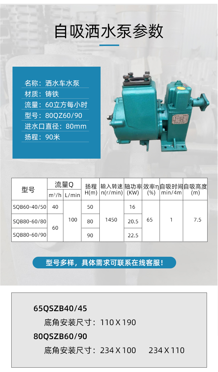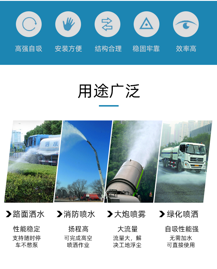 産品概述: 灑(sǎ)水車泵主要用(yòng)于灑水車,園林(lin)綠化灑水車,消(xiao)防灑水車等環(huan)衛汽車,可用作(zuo)路面清洗除塵(chén)等作用,後接✔️灑(sǎ)水車水炮可用(yong)作路旁綠化灌(guan)溉。 灑水