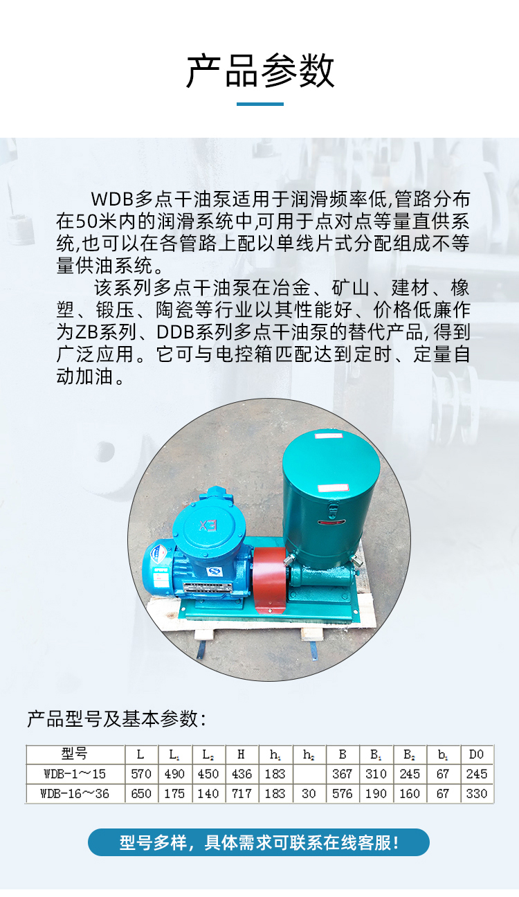 用途(tú): WDB系列多點幹油泵(beng)适用于潤滑頻率(lü)低,管路分布在50米(mǐ)内的潤滑🌍系統中(zhong),可用于點對點等(děng)量直供系統,也可(kě)以在🙇🏻各管路上配(pei)以單線片式分配(pei)組成不等量供油(you)系統。